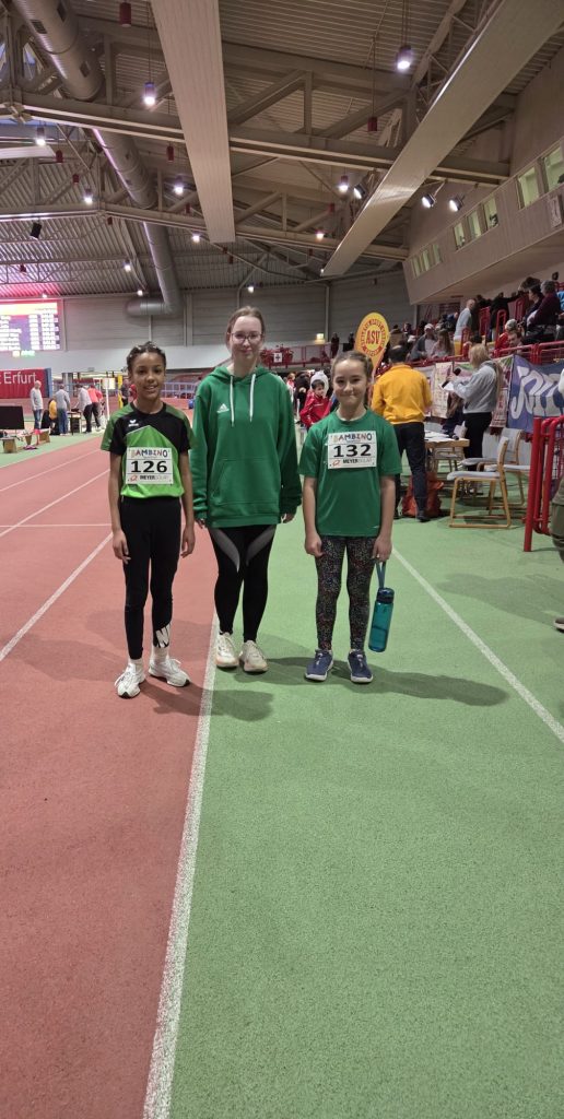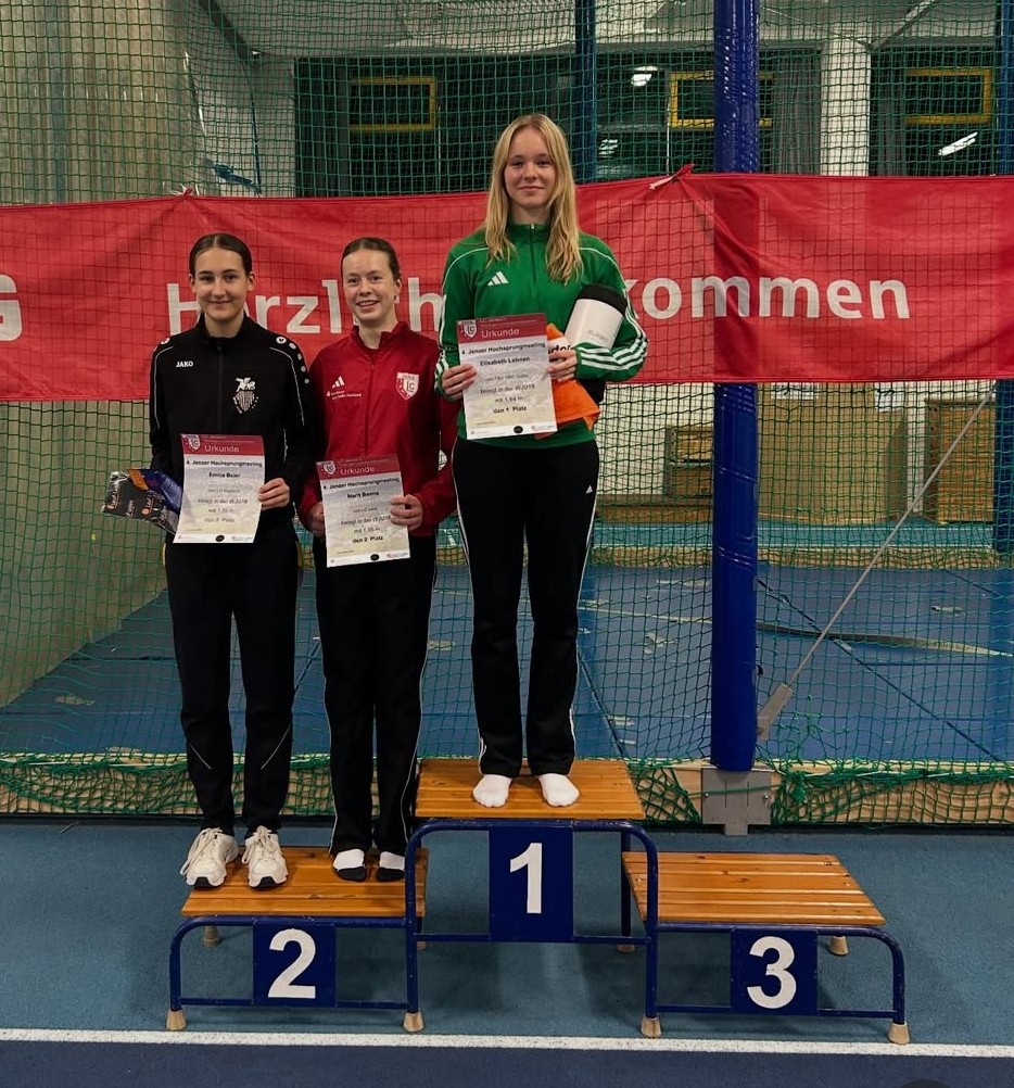 Zum 16. Hallenmeeting des TLV am 10.01.2026 in Erfurt waren unsere Athleten Elisabeth Lehnen WJU18, Jonas Eckstein MJU16 sowie Marvin und Josefine Wetzel M/WJU14 in den Disziplinen 60m Sprint und Weitsprung am Start. Alle zeigten gute Leistungen zum Auftakt in den jeweiligen Disziplinen. Weiter ging es am 17.01.2026 mit der Thüringer Hallenlandesmeisterschaft U18 und Winterwurf U16. Es startete Elisabeth Lehnen in den Disziplinen 200m, Weitsprung und Hochsprung. Hier holt sie sich zum 4. Mal in Folge den Hallenlandesmeistertitel im Hochsprung mit 1,63m. Ebenso Platz 6 im Weitsprung mit 4,72m und Platz 8 im 200m Lauf. Anna-Luisa Zunft mit Trainerin Sabine Kuno startete zum Winterwurf der WJU16 und holt im Speerwurf den Vizelandesmeistertitel mit 32,73m.