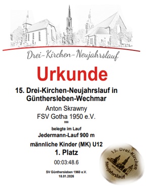 Zum 28. Bambino Sportfest des ASV Erfurt in Erfurt am 18.01.2026 waren 11 Kinder unserer Trainingsgruppe unter der Betreuung von Lilli, Henry, Cindy, Jacqueline, Roland und Marko am Start. Ganz vorne dabei und somit auf dem Treppchen: Leander Blau AK 7 jeweils Platz 1 im 50m und 200m Lauf sowie Platz 3 im Weitsprung, Elias Stucke AK 8 Platz 2 im 50m Lauf, Platz 5 im 800m Lauf und Platz 7 im Weitsprung, Adrian Hopf AK 10 den Titel verteidigt Platz 1 im 50m Lauf. Unsere kleinen Athleten erzielten allesamt gute Leistungen! Ebenfalls am Sonntag, den 18.01.2026 fand der 15. Drei-Kirchen-Neujahrslauf in Günthersleben-Wechmar statt. Hier startete Anton Skrowny im 900m Jedermann-Lauf und holte sich in seiner Altersklasse MJU12 den 1. Platz mit einer Zeit von 3:48 Minuten.