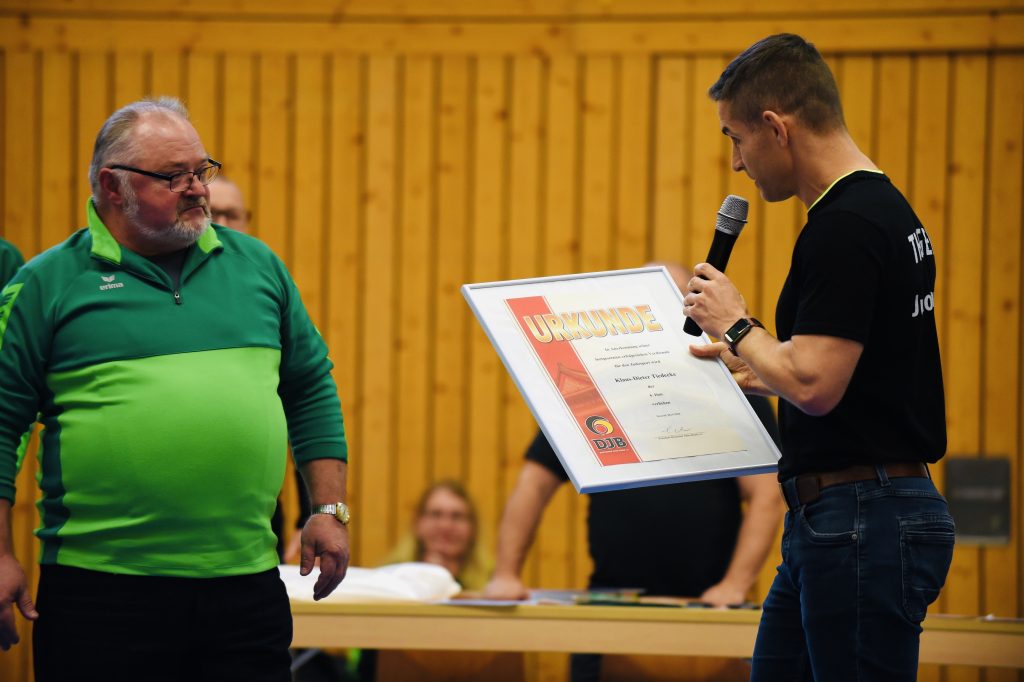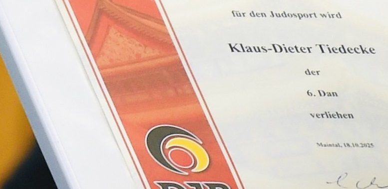 Mit dem 6. Dan wurde schließlich Klaus-Dieter Tiedecke (ebenfalls FSV 1950 Gotha) geehrt, der seit Jahrzehnten das Kata- und Prüfungswesen im Thüringer Judoverband entscheidend geprägt hat. Als Mitglied der Dan-Kommission, Kata-Beauftragter und heute als Prüfungsreferent des Verbandes hat er Strukturen aufgebaut, Standards entwickelt und das Thema Kata in Thüringen auf ein neues Niveau gehoben. Durch seine Lehrgänge, die Etablierung des Kata-Pokals und die Organisation der ersten Thüringer Kata-Landesmeisterschaft hat er Maßstäbe gesetzt. Sein ehrenamtliches Engagement ist dabei ebenso beeindruckend wie seine fachliche Expertise: Mit unermüdlichem Fleiß, großer Leidenschaft und persönlichem Einsatz hat er Wissen vermittelt, Nachwuchs gefördert und den Geist des Judo lebendig gehalten – sowohl auf der Matte als Trainer als auch im Verband als Ideengeber und Gestalter.